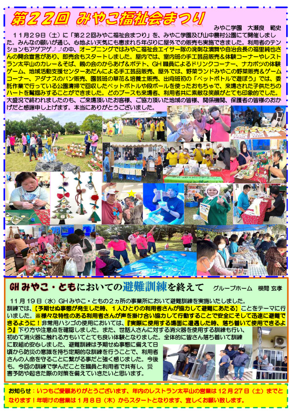 お問い合わせ下さい ・ みやこ学園 TEL: 0980-73-7770 FAX: 0980-74-2338 ・ 分場「アダナス」 TEL: 0980-74-1188 FAX: 0980-74-1288 ・ 野菜ランドみやこ TEL: 0980-73-1717 FAX: 0980-73-8005 ・ グループホームみやこ TEL: 0980-73-8883 |