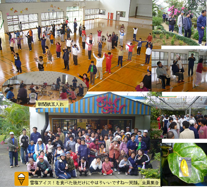2月18日(水)雨に降られることもなく下地体育館にて全体レクリェーションを開催しました。日頃たまりにたまった脂肪を燃焼すべく健康推進課からインストラクターのお姉さん達に来て頂きメタボ体操から開始。新聞紙を丸めた玉入れ競走のあと、借り物競走では課題が用意され「帽子をかぶったじゅんこさん」「ボールをもった砂川さん」などが書かれた紙の答えを探してみんな右往左往!答えに該当しているじゅんこさんや砂川さんはいつも引っ張りだされてつかれちゃったかな?一息ついて、待ちに待ったお昼のお弁当を思い思いの場所で食べてから、ちょっとお昼寝といきたいのですが、使った後はやはりきれいにと、体育館の掃除を済ませて、お昼からの見学先宮古パラダイスファームへいざ!蝶々園で蝶の見学ですが実は、お目当ての雪塩ソフトクリームに舌鼓。ふれあいプラザ宮古からギボケイタさんも参加し、毎日の作業から解放され皆で楽しんだ1日でした。係わってくださった皆さん、ありがとうございました。
