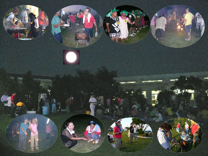 満月の光の中、関係者・保護者・利用者・職員が集い11台の鉄板を囲みバーベキューをやりました。バイキング方式でコーナーが設けられ、肉、野菜、焼きそば、ウインナー、焼き鳥と炭火焼のにおいがただよい、会場内は賑わいました。当初肉のコーナーに長い行列が出来るのではないか?と予想していたのですが、以外?にも一箇所に集中の混雑は見られませんでした。野菜も出足はやはり人気がなくコーナー担当は、暇〜。誰も食べないわけ?状況でしたが、時間が経つに連れ、野菜はまだ出来ていないわけ〜と要求されるほどの賑わいを見せほとんどなくなっていました。 さらには野菜ランドみやこの従業員企画でファッションショーがあり、レッドカーペットとまではいかないまでもブルーシートが敷かれ、場内一周する女装した皆さんに会場からドドッと笑いが起っていました。踊りタイムもあり、懐かしい♪♪♪が次々流れ皆さん若い頃を思い出したかのようにノリノリルンルンで盛り上がりました。最後に花火を手に手に楽しみました。 皆さん楽しい夜をありがとう。お疲れ様でした。