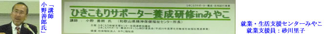 ![]() 「ひきこもりサポーター養成研修」を去った、1月18日、24日の両日に開催いたしました。講師に、和歌山県精神保健福祉センター所長 小野善郎氏をお迎えし、ご講義いただきました。開催には、NPO法人エスペーロ様のご紹介があり実現いたしました。18日には、約50名の来場があり、「ひきこもり」についての宮古島市においての関心の高さを感じることが出来ました。 第2回目は1月24日(金)に「援助計画の立案と援助方法」、「宮古島市におけるひきこもりの支援の可能性」と題してのご講義をいただきました。 ひきこもり支援の基本として本人だけの支援ではなく、家族など状況に応じて支援が必要でありまた、専門家の支援だけでなく地域のあらゆる資源を活用して行く事も重要と話されていました。また、今後宮古島市での支援の可能性としては島内独自のネットワークを活用し「ひきこもり」のイメージにとらわれることなく、困っている若者を支援していくという柔軟な発想での対応が可能なのではないでしょうか?との話をいただきました。 今回の研修を通して今後の支援におおいに活用できると思った事として、「ひきこもり」だけでなく、どのような支援に対しても、見立てに始まり、悪循環をひとつでも見つけ出し、イメージにとらわれる事のない支援の重要性を再確認させられた研修でした。 講師の小野先生、開催にご協力いただきました皆様、ご参加いただきました皆様、本当にありがとうございました。今後とも何らかの支援を必要とする皆様への支援に、相互協力で進めていきますよう、よろしくお願いいたします。 ![]() 坂本龍馬がやってキターーーーーーーー!2月3日の月曜日、平成の坂本龍馬こと松尾貴臣さんがみやこ学園にやってきました。松尾さんはがん患者の方との出会いをきっかけに全国の施設や病院で無料ホスピタルライブを行う活動をしており現在まで950箇所以上でライブを行っております。その活動の中で縁があり高知県の観光特使にも任命されているプロのミュージシャンです。今回は宮古島デビューがみやこ学園でのライブでありみんなの大好きな「世界に一つだけの花」や松尾さんの人気曲「絆」の力強い歌声に指笛やダンスにと大いに盛り上がりました。松尾さんは明日もまた那覇でライブがあるとその日のうちに宮古島を離れましたが、また絶対きますという熱い約束を交わして行きました。松尾さんのこれからの活躍と次のライブを本当に楽しみにしております。ありがとうございました。