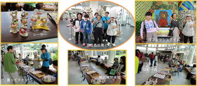 沖縄県手をつなぐ育成会主催の文化祭りが9月5日(土)浦添市てだこホールにおいて開催されました。「手をつなぎ、このぬくもりをわかちあおう」「支え支えられ共に暮らせる地域社会を!」をスローガンに障がいのある人達が様々な文化や芸術活動に取り組んでいる日頃の活動成果を発表する機会を設け、同じ障がいのある仲間や地域の人達との交流を通じ、自立した社会生活の楽しさや喜びを提供して理解と親睦を深めて行こう。という趣旨があります。この文化祭りにみやこ福祉会から生活介護事業所みやこの利用者・職員6名で参加してきました。舞台発表、作品展示、展示即売の3部門が設けられており今回、私達は展示即売で授産品の販売を行いました。宮古島から初めての参加という事で関係者の方及び他施設の皆さんも大いに歓迎して下さって、たくさんのご協力(おやつの差し入れやお買い上げ等)をして頂きました。販売で特に人気を集めたのが、宮古島の自然の素材を利用して作られた貝細工や木の実(愛称ラブちゃん)小さなぞうりのストラップ等で、自分の作った物を“かわいい”と言って買ってもらうと大きな声で「ありがとうございます」とお辞儀をする様子が見られ、利用者さんも自信に繋がったようです。今回、販売だけでなくたくさんの方との交流があり、参加して良かったと感じる事が出来又、新たな意欲に繋がりました。ご尽力頂いた関係者の皆様に感謝申し上げます。