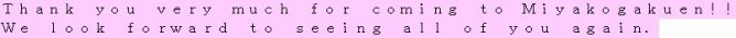 お問い合わせ下さい ・ みやこ学園 TEL: 0980-73-7770 FAX: 0980-74-2338 ・ 分場「アダナス」 TEL: 0980-74-1188 FAX: 0980-74-1288 ・ 野菜ランドみやこ TEL: 0980-73-1717 FAX: 0980-73-8005 ・ グループホームみやこ TEL: 0980-73-8883 |